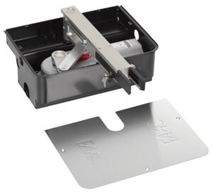 Принцип роботи: Привід встановлюється в спеціальний герметичний бокс, який закопується в землю безпосередньо під вісь обертання стулки. Рух передається на ворота за допомогою важеля, що кріпиться до нижньої частини стулки.
